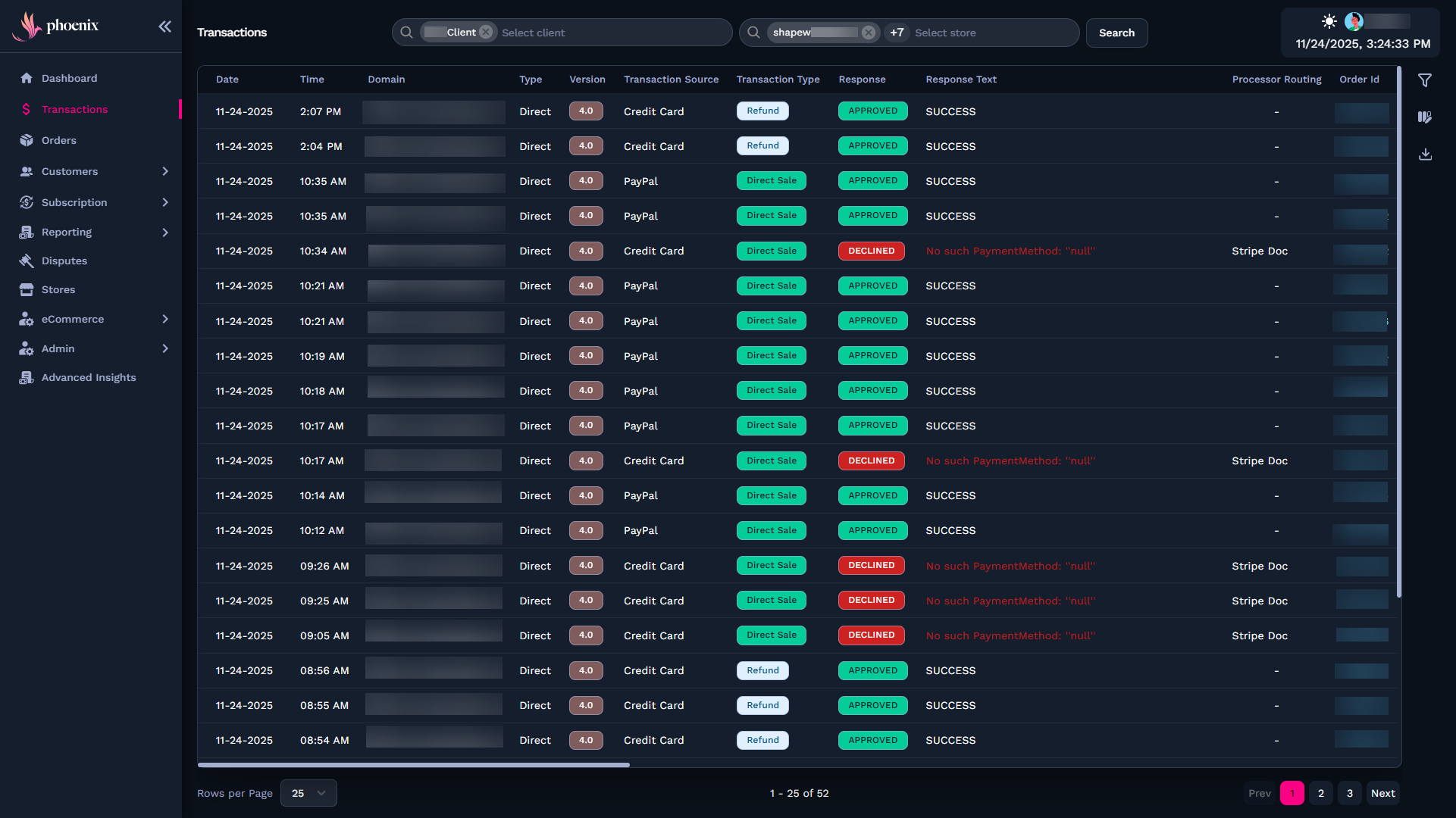 The Transactions section shows every payment attempt across your stores. Use it to audit payments, confirm results, and troubleshoot declines.