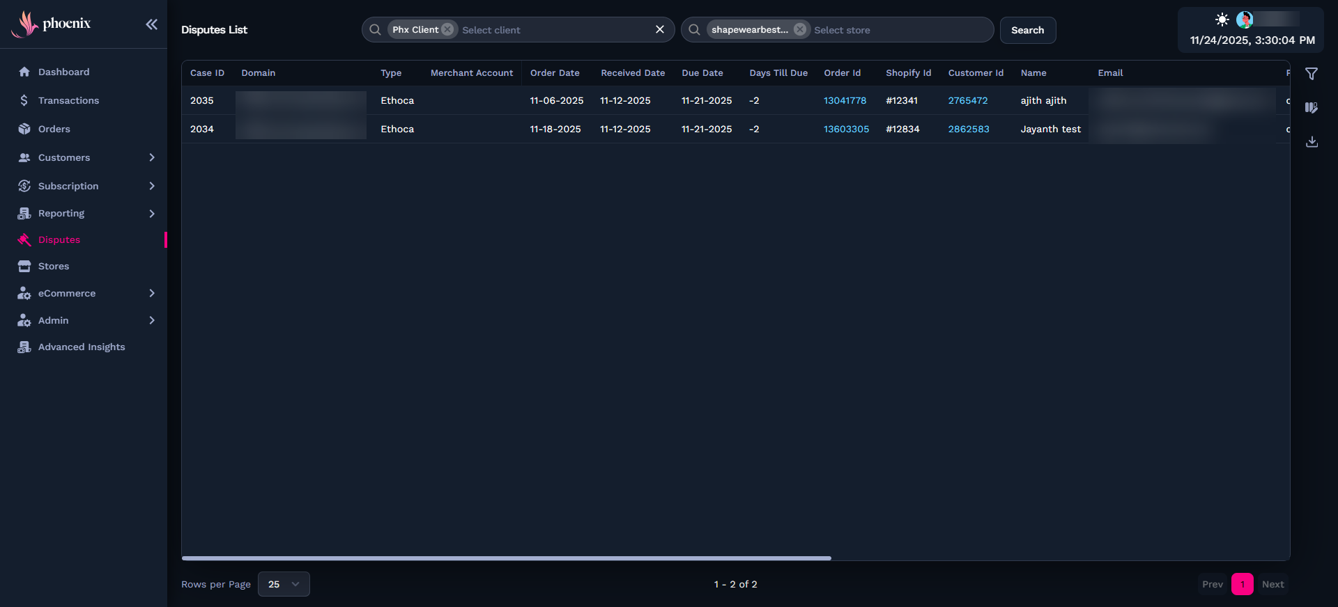 Use the Disputes page to review chargebacks sent by processors such as Ethoca. This view groups every active dispute across your stores and shows the data needed to evaluate and respond to each case.